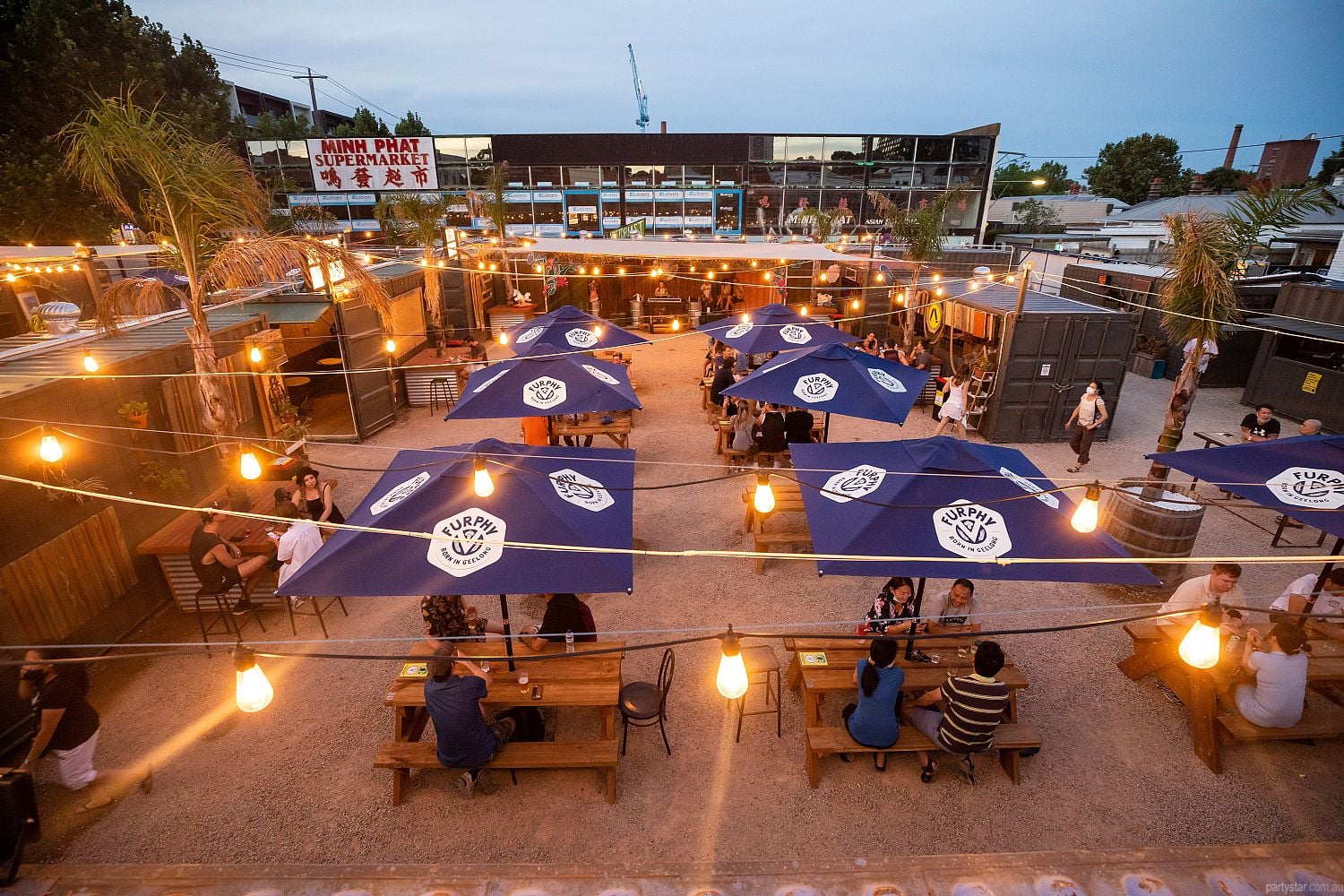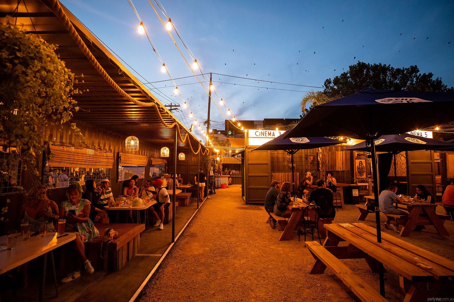 The beer garden boasts cloth shade and umbrellas. You will also enjoy exclusive access to booth seating along Victoria Street, shuffleboard containers, and retro cinema containers.
